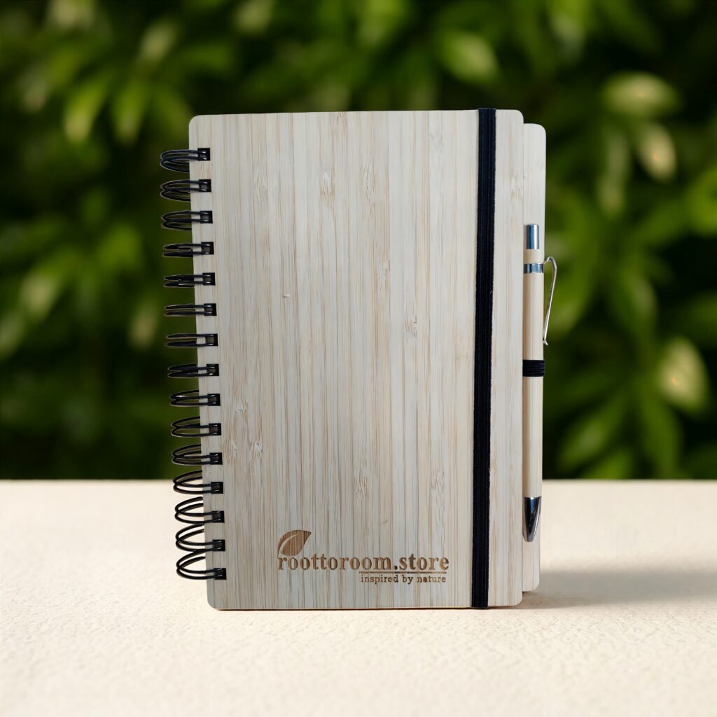 A compact, eco-friendly bamboo diary crafted with a natural bamboo cover and 100% recycled lined paper. Lightweight and travel-friendly, it features a matching pen securely held with an elastic band—perfect for notes on the go. Stylish, practical, and ideal for daily use, gifting, or custom laser-engraved branding.
